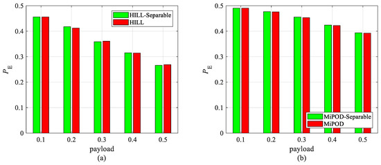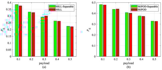 Since our scheme is based on the baseline embedding algorithms, e.g., HILL, MiPOD, it is necessary to verify that our scheme will not decrease the undetectability of the existing data-hiding methods. The undetectability comparisons between our scheme and the baseline embedding algorithms with 5 senders () are shown in Figure 5 and Figure 6, where “HILL-Separable” and “MiPOD-Separable” stand for the cases of our scheme with secret data embedded using HILL and MiPOD, respectively. It can be observed that our scheme that achieves multisource data hiding has not decreased the undetectability of the existing data-hiding methods. This is reasonable since the undetectability is determined by the embedding matrices, which are obtained using an existing data-hiding framework and kept unchanged in our schemes. This verifies that our scheme achieves multisource data hiding without decreasing the undetectability of the data hiding.