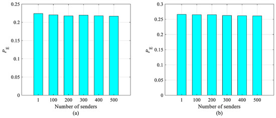 To further verify the effectiveness of our scheme, we considered the cases of a big number of senders. With embedding algorithm HILL and payload 0.5 bpp, the undetectability of our scheme for the cases of 100, 200, 300, 400, and 500 senders () are shown in Figure 7. The results indicate that the values for big number of senders are comparable with the case of one sender. That means the increment of number of senders have not cause inferior undetectability. This is reasonable since the undetectability of data hiding is determined by the embedding algorithm and payload. In our scheme, the two issues are unchanged; therefore, our scheme achieved the function of multisource without decreasing the undetectability of the existing data hiding ability.