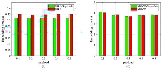 For data hiding, computational complexity is also an important indicator. We also conducted experiments to compare the computational complexity between our scheme and the baseline embedding algorithms. All 1338 images in UCID were employed for data embedding, and then the average embedding time (s) for each image is shown in Figure 8. Similarly, “HILL-Separable” and “MiPOD-Separable” stand for the cases of our scheme with secret data embedded using HILL and MiPOD, respectively. The results were tested on a server with 3.7 GHz CPU, 16 GB memory, and Windows 7. The type of system is 64 bit and the version of MATLAB is R2017b.