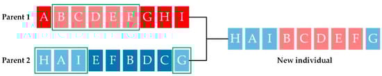 The crossover operation represents mating between individuals. Two individuals are selected as parent chromosomes according to the selection operator, and crossover sites are chosen at random. The genes at these crossover sites are then exchanged, thus creating a completely new individual. The parent chromosome mainly passes on its good traits to the next generation. If a chromosome uses two coding methods at the same time, the crossover can only be operated between the same coding segments. See Figure 2 for an example.