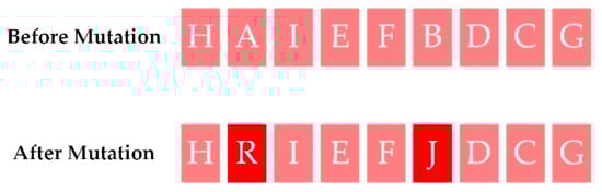 The fundamental goal of mutation operation is to inject random genes into offspring to keep the population diverse and avoid premature convergence. The mutation itself can be considered as a randomized algorithm, which is an auxiliary algorithm used to generate new individuals. See Figure 3 for an example.