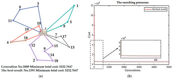 The calculation result of the example: (a) Optimal supply plan: spare parts delivery route diagram for each site; (b) The convergence of genetic algorithm.