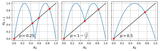 Figure 1 shows the M-map graphically. This figure shows that this system looks like the letter “M” and, hence, the name of this map: M-map. Moreover, it can be observed that when the p parameter changes from the value of p   =   0.25 to p   =   0.5 , the form of the map changes from two parabolas to the letter “M” to switch finally to the logistic map for p   =   0.5 . It can also be easily seen that this map is symmetric about the line x   =   1 2 .