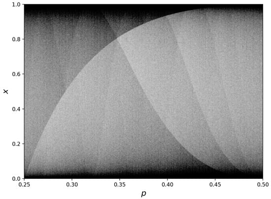 The bifurcation diagram shows the solutions of the system depending on the value of its parameter. For M-map, the bifurcation diagram of the mapping is shown in Figure 2. It can be read that the M-map has no visible periodic windows, which makes the behavior of the dynamical system in this area chaotic. Moreover, the iteration variable density for the given p parameters is noticeable. The darker area around the values of 0 and 1 means that there is a greater accumulation of the mapping values. Thus, the density of the M-map will have a U-like shape similar to the logistic map density. This observation was confirmed in the analysis of the invariant density in Section 4.4.
