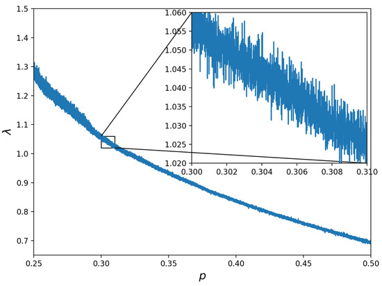 Figure 3. The Lyapunov exponent of (6) for different values of the p parameter ( Δ p = 0.000005 ).