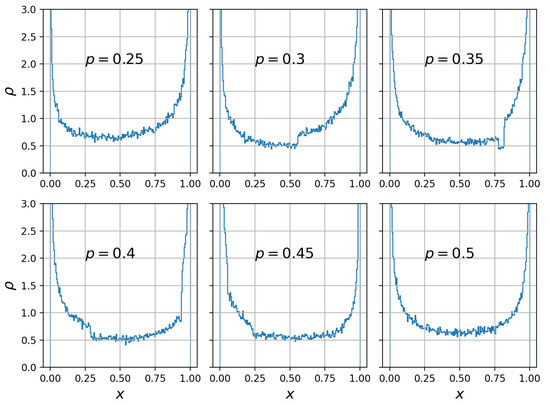 Graphs of the numerically obtained densities for the selected p parameter values are shown in Figure 5. The lower right graph shows the invariant density of the logistic mapping for the value of the parameter a   =   4 , which can be determined by the following formula