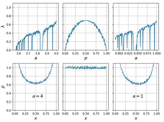 The value of the Lyapunov exponent determines whether the obtained orbit is stable ( λ     0 ) or whether the trajectories starting from close initial conditions diverge after some time ( λ   >   0 ). It should be emphasized that condition λ   >   0 is only a necessary condition for chaos to occur. Another valuable feature of dynamical systems is the so-called invariant density, which from a practical point of view is the distribution of the iterated variable, which can be obtained by solving the Frobenius–Perron [17,18] equation. Both the Lyapunov exponent value and the invariant density are normally obtained numerically.