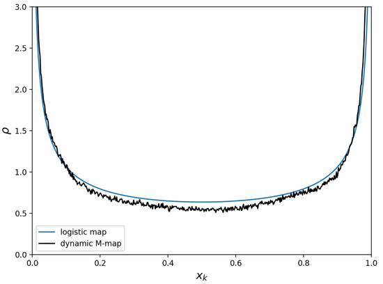 Invariant density allows determining the probability distribution of the iterated variable. It can be determined from the Frobenius–Perron [17,18] formula. However, as a rule, determining it in an analytical manner is difficult or even impossible. For this reason, it is approximated numerically using histograms.