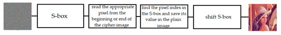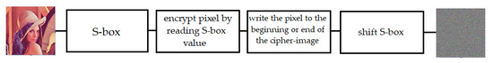 A simple encryption algorithm was developed to demonstrate the use of the M-map that depicts the image’s encryption. This encryption procedure is based on using a dynamic S-box and saving the encrypted pixels in the appropriate place in the cipher-image. The S-box dynamics consist of its dynamic shift for each encrypted pixel. Moreover, successive pixels are stored in the first free position from the beginning or end of the cipher-image. The value of the M-map determines which variant is selected.