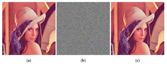 Figure 10. Image of Lena, its cipher-image and decrypted image. (a) Image of Lena; (b) cipher-image of Lena; (c) decrypted image of Lena.