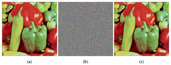 Figure 11. Image of Peppers, its cipher-image, and decrypted image. (a) Image of Peppers; (b) cipher-image of Peppers; (c) decrypted Peppers image.