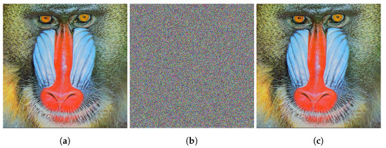 Figure 12. Image of Baboon, its cipher-image, and decrypted image. (a) Image of Baboon; (b) cipher-image of Baboon; (c) decrypted Baboon image.