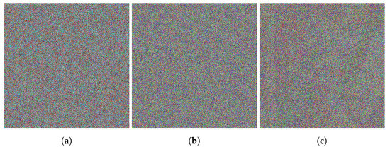 Figure 14. Images recovered with invalid values of keys. (a) Initial condition value changed by 10 16 ; (b) parameter value changed by 10 16 ; (c) the key from the S-box changed by 1.