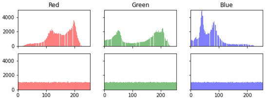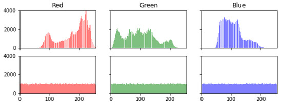 Figure 15. Histograms of Lena (Figure 10a (top row)) and its cipher-image (Figure 10b (bottom row)).
