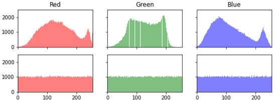Figure 16. Histograms of Pepper (Figure 11a (top row)) and its cipher-image (Figure 11b (bottom row)).