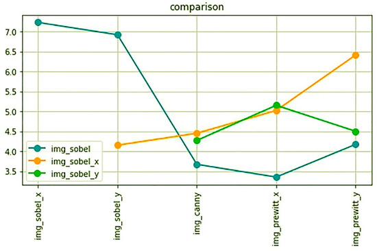 The experiment was performed as follows. The original image was illuminated at 50 lux, 70 lux, 100, 260, and 2300 lux. These images are presented in Figure 2, Figure 6, Figure 10, Figure 14, Figure 18, Figure 22 and Figure 26, respectively. Canny, Sobel, and Prewitt filters were used for these images. These filtered images were compared with each other to assess the best performance of the filter and to make recommendations for the use of certain filters. Diagram 1 shows three graphs of the relationship between the signal-to-noise ratio of the filtered images. The blue color shows the values of the signal-to-noise ratio between img_sobel and img_sobel_x. This value takes the value of 7.23 and is the largest value in this chart, and therefore, they are the most similar to each other. The second value is the result of comparing img_sobel and img_sobel_y and takes the value of 6.92. We also observe high PSNR values compared to others, which explains that very similar transformations were used. The other values are a comparison between the pairs img_sobel and img_cany and img_sobel and img_prewitt_x, and img_sobel and img_prewitt_y. Because filtering was applied by other filters, the images are less similar, and that makes sense. Charts of other colors, similar to img_sobel_x and img_sobel_y, work similarly. Slightly higher values between the pairs img_sobel_x and img_prewitt_y are explained by the better finding of contours in the image, which should be taken into account when choosing one filtering method.