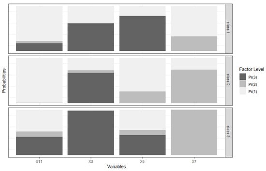 Furthermore, the four selected variables (X3, X6, X7, X11) were modelled using LCC analysis. Table 3 describes the results of grouping villages with the selected variables for the two-cluster to ten-cluster models. Model 3 (three-cluster) presented the lowest AIC and adjusted BIC values; however, Model 2 (two-cluster) presented the lowest estimate for BIC. Therefore, Model 3 was chosen as the optimal model considering that the adjusted BIC value is the most accurate information criterion, as recommended by Yang [29]. From the explanation above, it can be concluded that the selected number of clusters was a model with three latent classes. The complete comparison of the model after the variable selection is shown in Table 3, while the item response probabilities for each variable are shown in Figure 1. In general, the result of this clustering was that 95 villages were members of the first cluster, 166 villages were members of the second cluster, and 40 villages were members of the third cluster. The ranking of villages according to the socio-economic aspects of villages in 2018 in Banyumas Regency can be concluded as follows: