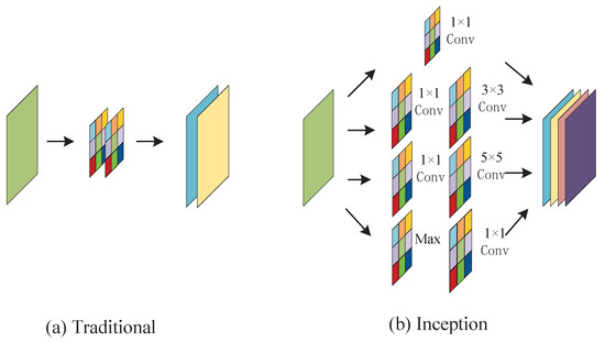 The different sizes of the convolution kernels allow for richer information to be extracted from the features. At the same time, multi-scale convolution uses the principle of decomposing sparse matrices into dense matrices to speed up the convergence. A comparison of the traditional convolution and inception modules is shown in Figure 1.