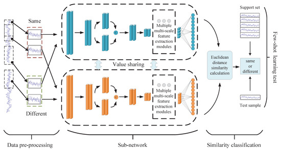 The overall architecture of MLS-net is shown in Figure 2. We fuse the improved sub-network with a Siamese network. A multi-scale and lightweight bearing fault diagnosis architecture applied to the small sample situation is constructed. The whole structure body consists of two symmetrical branches. As we can see from the figure, the overall architecture contains four parts: data pre-processing, the sub-network, similarity classification and the few-shot learning test.