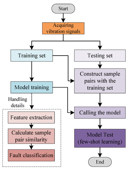 - Model training: The training set is divided into sample pairs with equal proportions of the same and different classes of faults. We feed the training samples into the network. Then, the network is trained by using the Adam gradient descent algorithm and a binary cross entropy loss function. Finally, we save the model with the best training results.