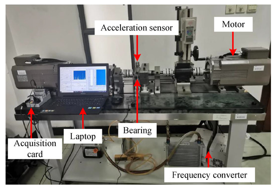 The main structure of the test bench is shown in the diagram below. The components are the following: accelerometer, bearings, motors, acquisition cards, frequency converter and external computers and other key devices. The positions of the individual devices are marked in Figure 5. The entire experimental equipment is rotated by motors driving the bearing parts. The accelerometers collect the vibration signal in real time. The vibration signal is then transferred to the computer for storage and analysis by means of an acquisition card.