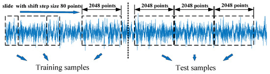 Each type of fault data is a vibration signal collected by an accelerometer. To ensure consistent conditions with the comparison schemes, the dataset is constructed based on the method in [29]. The detailed schematic diagram for building the training and test sets is shown in Figure 6. We build the training set from the first half of the vibration signal and the test set from the second. Each training sample is 2048 points in length. We use a sliding window with a step size of 80 to intercept the training samples sequentially backwards. The data intercepted by the sliding window is the training set. The second half of the vibration signal is divided into multiple non-overlapping test samples, and each test sample also contains 2048 points.