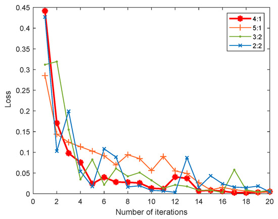 The training samples are divided into the training set and validation set. By comparing the loss rate under different ratios in Figure 7, the ratio of the training set and validation set is configured to be 4:1 for better convergence performance. In addition, the model is implemented using the Keras library and Python 3.6. The total epoch of model training is 15,000, and the small batch size is 32. The optimal model is saved after 20 training sessions have been conducted in the experiment.