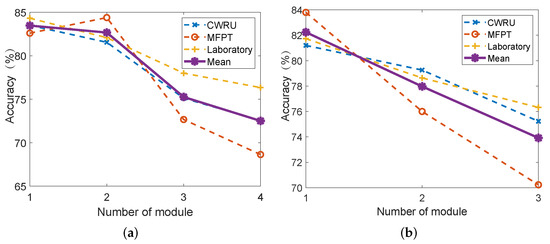The comparison between Table 4 and Table 5 shows that the trend of the accuracy of the model decreases as the number of the IncConv1 increases. This shows that the number of modules for IncConv1 should be 1. Figure 8a,b shows the variation of accuracy on each data set and the mean of the three types of data. The mean lines in both plots show that, as the number of modules increases, the accuracy rate decreases. However, our previous analysis shows that the number of IncConv1 should be 1.