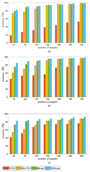 In this section, we want to verify that the proposed method performs well in the case of insufficient samples. We chose the methods described above: (SVM), 1D-CNN, BS-net and MLS-net for performance comparison. Several models are tested on three bearing fault datasets. Table 6 and Figure 9 show the results of the experiments.
