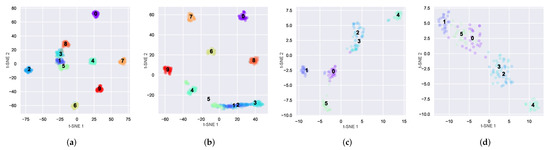 Visualization via t-SNE: (a,b) CWRU dataset, (c,d) Laboratory dataset.