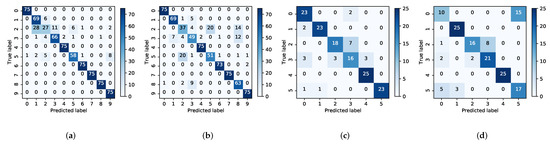 Confusion matrix: (a,b) CWRU dataset, (c,d) Laboratory dataset.