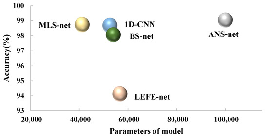 In Figure 12, we mainly depict the relationship between model accuracy and total number of parameters. The horizontal coordinate indicates the model parameters. The vertical coordinate indicates the accuracy rate. The accuracy of each model is obtained from the experiment when the sample size is set as 900 for the CWRU dataset. As we can see from Figure 12, MLS-net shows the better performance in terms of the model parameters and accuracy compared with 1D-CNN and BS-net.