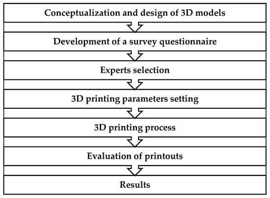 Summing up the information above, the research consisted of the main seven stages. They are presented in Figure 1. The first stage was conceptualization and design of 3D models. The authors designed eight different cube-based models. The models were designed in the Autodesk Fusion 360 software. Then, the important part of the research was the development of the survey questionnaire. The next stage was the selection of experts. Subsequently, the printing parameters were set for two types, from a 3D printer for the same producer to start printing in the next step. The final stage was the evaluation of the printouts. The research was conducted in the first quarter of 2022.