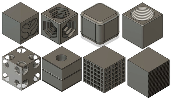 The effects of the first stage of the research were eight 3D cube-based models, designed in Autodesk Fusion 360 software. Figure 2 presents the designed eight different models. The eight models differed slightly from each other. The common feature for all of the models was symmetry. All cube-based models were symmetric about point, axis, and plane.
