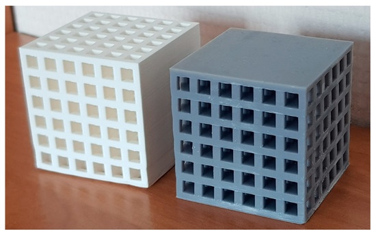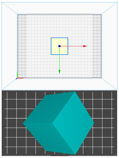 The symmetric layout for each model on the 3D printer worktable was to verify the operation of the nozzle of this machine in relation to all axes (Figure 3). Moreover, the symmetry of the models made it possible to check the quality of printouts on each side in three planes. In addition, all models were 50 mm × 50 mm × 50 mm.