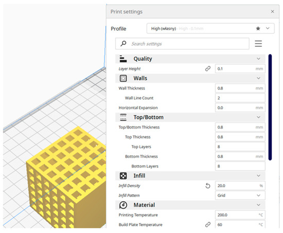 View of model prepared for printing in slicing software—a part of the CURA 4.13.1 interface [authors’ own study].