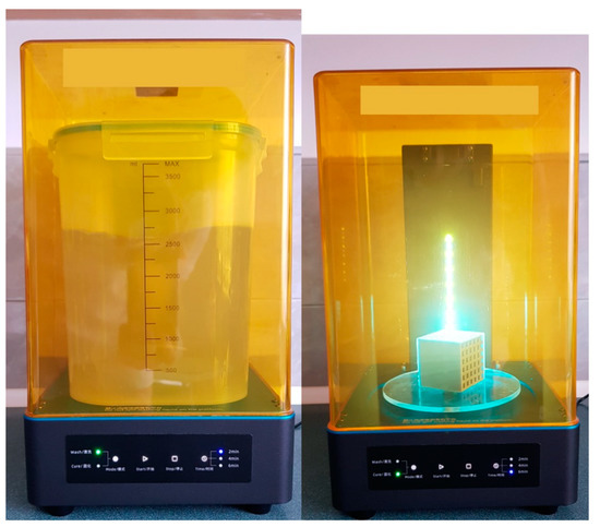 The process of rinsing the printout (on the left) and hardening (on the right). The origin of the presented equipment: [38]; [authors’ own study].