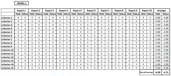 The average results of the assessment of the printouts according to the 15 criteria for FDM and MSLA technology [authors’ own work].