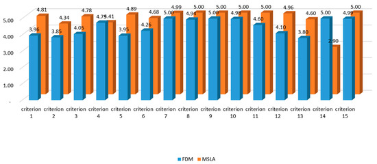 After analyzing all 2400 data, it was calculated and concluded that the overall average value for FDM technology was 4.48 and for MSLA technology was 4.69. MSLA 3D printing technology got better results according to almost every criterion. The average results according to the 15 criteria are presented in Figure 9. The MSLA technology was evaluated worse than the FDM technology according to only two criteria—the accuracy of the edges and the nuisance of the smell emitted by the printer. For both technologies, the best evaluation was for criterion 7 (lack of cracks), 9 (lack of rolled up layers), 10 (lack of delamination), and 15 (lack of visible asymmetry of the printout)—they were rated higher or equal to 4.98. The MSLA technology achieved an average of 5.0 according to the following criteria: 8 (lack of melting), 9 (lack of rolled up layers), 10 (lack of delamination), 11 (lack of visible gaps between layers), and 15 (lack of visible asymmetry of the printout). In turn, FDM technology was rated 5.0 according to three criteria, which were 7 (lack of cracks), 9 (lack of rolled up layers), and 14 (assessment of the nuisance of the smell emitted by the printer). In the case of FDM technology, the lowest values were in accordance with criterion number 13 (assessment of the noise of working printer)—3.8 points. The MSLA technology obtained the lowest evaluation according to criterion number 14 (the nuisance of the smell)—2.9 points. It was the lowest value of all the average values.