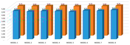 The data were also analyzed in the context of the model of the evaluation of the given object’s model. Figure 10 shows the average values for every printed object depending on the designed model for both printing technologies. The highest value for both technologies was achieved for model number 8 (4.63 points for FDM technology and 4.74 points for MSLA printing technology). The lowest value got model 5 (4.35 points for FDM technology and 4.64 points for MSLA printing technology). These values can be explained by the complexity of the designed models. Thus, the highest value was in the case of the regular cube, the lowest value—the most complicated model, which translated into loss of quality for the final printout. All the objects were evaluated quite well, which means that two 3D printing technologies are characterized by the high quality for such unit manufacturing. It shows that those technologies can be used by unit production manufacturers, graphic designers and to customers using their services and products, as well as by hobbyists and amateurs of 3D printing.