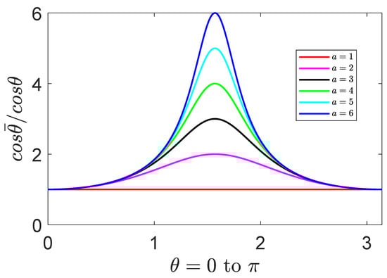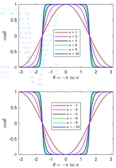 where a is a constant, and can be regarded as a real number. Figure 1 and Figure 2 show the graphs of  and  for some values of a. They are periodic functions with the range  and  except for the trivial case  for the latter. The locations of the extreme values of these functions coincide with those given by  and . An interesting feature of the function is that  () is an anti-symmetric (symmetric) function with respect to the negative value of a. The line element for the surface can be expressed as