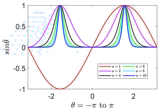 (Color online) The graph shows how the sine function with the conformal variable  deforms with the positive values of the index a, where  corresponds to the curve of the common sine function. The function  is a symmetric function with respect to a and .