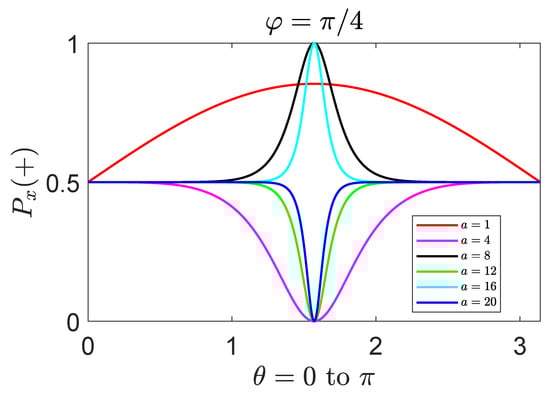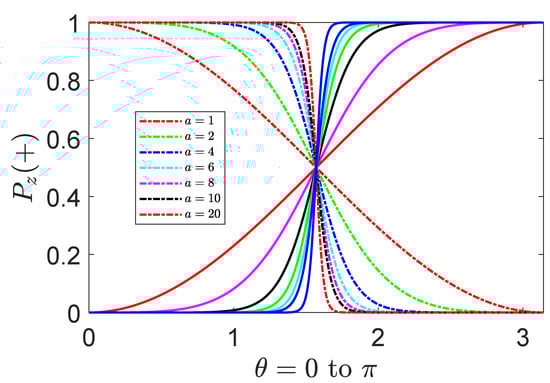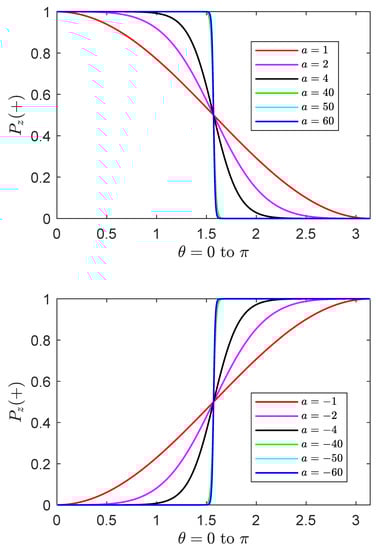 They are independent of . The graphs in Figure 3 show the probability  which is manipulable by the index a, and the probabilities corresponding to a and  are complementary. This implies that one can control the probability through the modulation of the index a. The spin orientation of a prepared state  in the laboratory will almost definitely collapse to the z (negative z) direction in a measurement when the variable  () if the index value . The average of the two measurements above is  which can also be tuned by the index. Analogously, the probabilities of the spin state  to appear in the , and  directions are given by