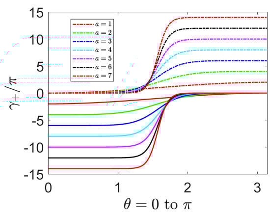 Figure 5 shows the variation of the phase at the different latitudes on the Bloch sphere. The evolution path at a specific  can be altered by the index a. We see that the phase with  in the domain  is complementary to  in , and the evolution processes of the phase for  are allowed drastic changes around  which show up different interference patterns. For the other spinor with eigenvalue , we have the Berry potential