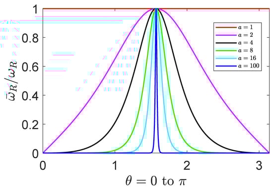 where the index a can only be an integer due to the requirement of the single-valued condition of the Hamilton operator. Figure 7 exhibits the ratio of the resonant frequencies. There are three interesting features. (i) The resonant frequency basically decreases with the increase of the index n over most of the domain of , and the frequency is altered at the specific latitude  according to the integer n. (ii) Any value of  can be achieved by an arbitrary integer. Nevertheless, the allowed resonant domain of  is controlled by n. (iii) The resonant frequency is very sensitive to the conformal deformation. The resonance can only happen around  when the index comes to . This means that the resonance only occurs in the systems with tiny level spacing when the field  is constructed with a large index n.