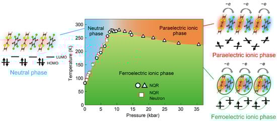 - Okamoto, H.; Koda, T.; Tokura, Y.; Mitani, T.; Saito, G. Pressure-induced neutral-to-ionic phase transition in organic charge-transfer crystals of tetrathiafulvalene-p-benzoquinone derivatives. Phys. Rev. B 1989, 39, 10693–10701. [Google Scholar] [CrossRef] [PubMed]