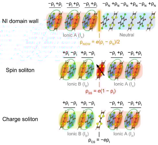 Topological excitations in neutral–ionic phase transition systems. ρNIDW, ρSS, and ρCS are topological charges of a NI domain wall, a spin soliton, and a charge soliton, respectively. ρN and ρI represent the degree of charge transfer from HOMO of TTF and LUMO of CA in the neutral and ionic phases, respectively. Modified with permission from []. Copyright 2019, The Authors, some rights reserved; exclusive licensee AAAS. Distributed under a CC BY-NC 4.0 License (http://creativecommons.org/licenses/by-nc/4.0/ (accessed on 15 November 2021)).