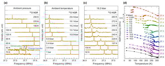 (a–c) Temperature and pressure profiles of the 35Cl-NQR spectra. (d) Temperature dependence of the 35Cl-NQR frequencies at fixed pressures. Reprinted with permission from []. Copyright 2018, American Physical Society.