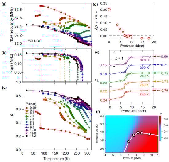 Temperature dependence of the center of gravity of 35Cl-NQR frequency (a), line splitting width (b), and the degree of charge transfer ρ evaluated from the 35Cl-NQR frequency (c) under various pressures. (d) The jump in ρ, Δρ, at the dimerization temperature. (e) Pressure profiles of ρ at fixed temperatures. (f) The contour plot of ρ in the pressure–temperature phase diagram. Open circles represent the phase transition temperatures Tc determined by the NQR experiments, corresponding to those in Figure 2. Reprinted with permission from []. Copyright 2018, American Physical Society.
