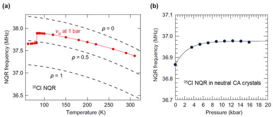 (a) Relationship between the 35Cl-NQR frequency νQ and the degree of charge transfer ρ at ambient pressure. Red circles are the experimental νQ values at 1 bar and red line is a guide for the eye. Broken lines are the calculated temperature dependence of νQ in the state of ρ = 0, 0.5, and 1, expressed by the Koukoulas function. (b) Pressure dependence of the 35Cl-NQR frequency in neutral CA crystals at room temperature. The line is a fit of a[1 − exp(−bP)] to the data (see text and [] for details). Reprinted with permission from []. Copyright 2018, American Physical Society.